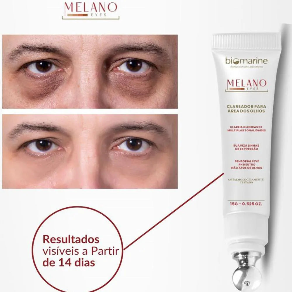 Ideal para clarear olheiras de múltiplas tonalidades, Biomarine Melano Eyes é um produto oftalmologicamente testado de uso diário, com resultados comprovados na redução das manchas de fundo pigmentar com coloração castanha ou azul, e olheiras de origem vascular ou provocadas por cansaço.