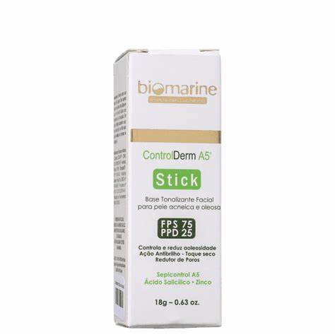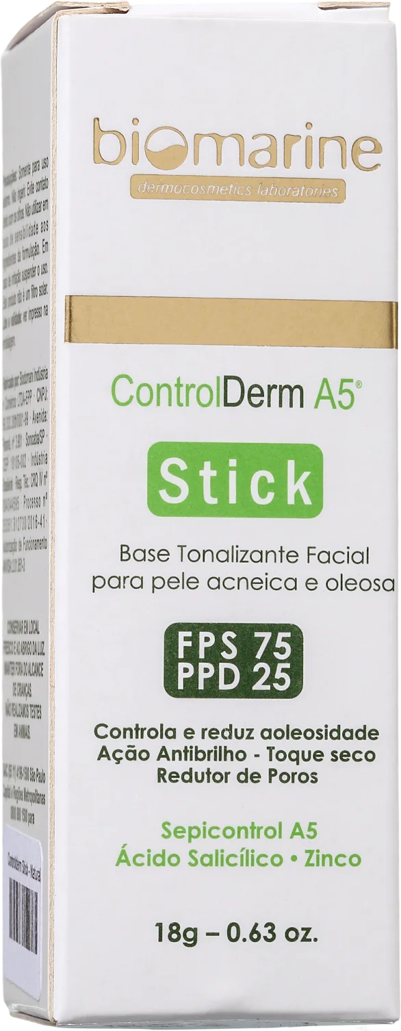 A Base em Bastão Control Derm, da Biomarine, conta com ação antibrilho e toque seco para eliminar a preocupação com a oleosidade. Seus ativos ainda previnem o surgimento da acne e impedem a obstrução dos poros.