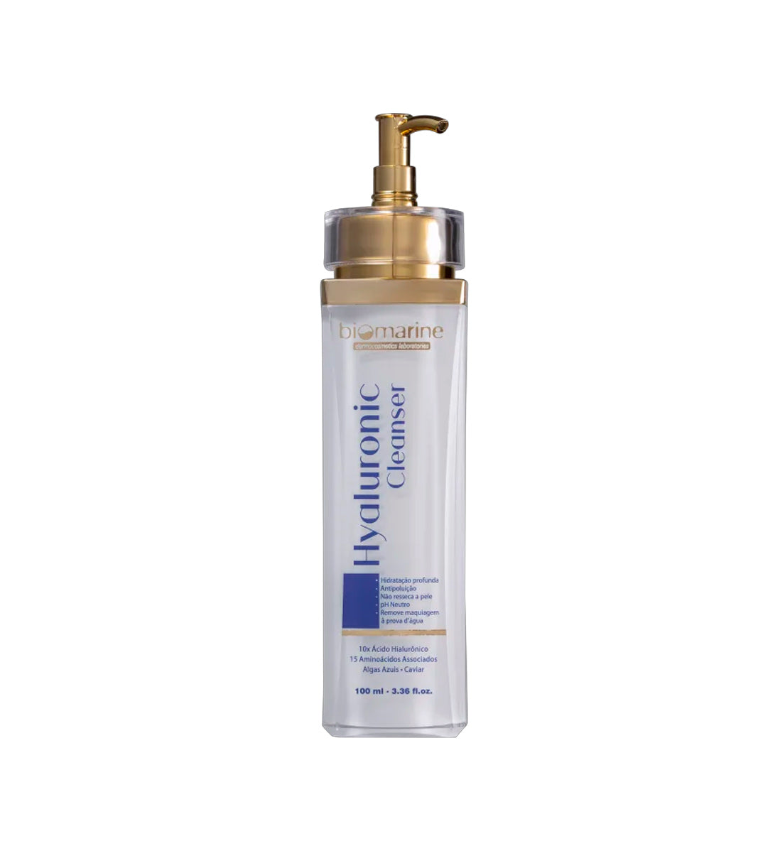 Biomarine Hyaluronic Cleanser conta com 10 tipos de Ácido Hialurônico que atuam na hidratação intensa. Assim, oferece limpeza eficaz sem ressecar a pele.