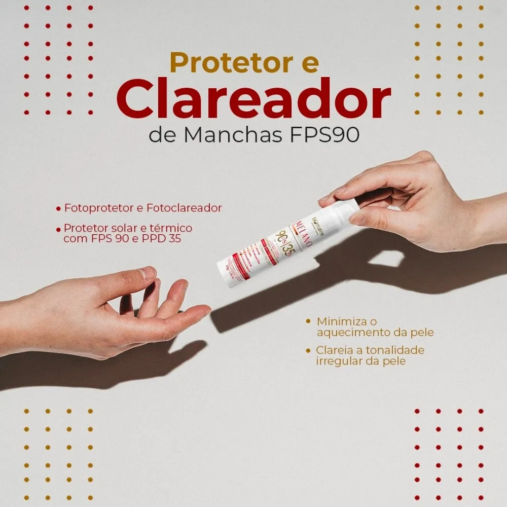 Melano Defense é um protetor solar que foi desenvolvido com ingredientes que atuam na redução das manchas faciais tornando diariamente a tonalidade da pele mais uniforme. Sua fórmula concentrada com ação antioxidante e protetora, clareia e renova a pele. Além de protetor solar e térmico com FPS 90, oferece tratamento eficaz no clareamento de manchas e Melasma!