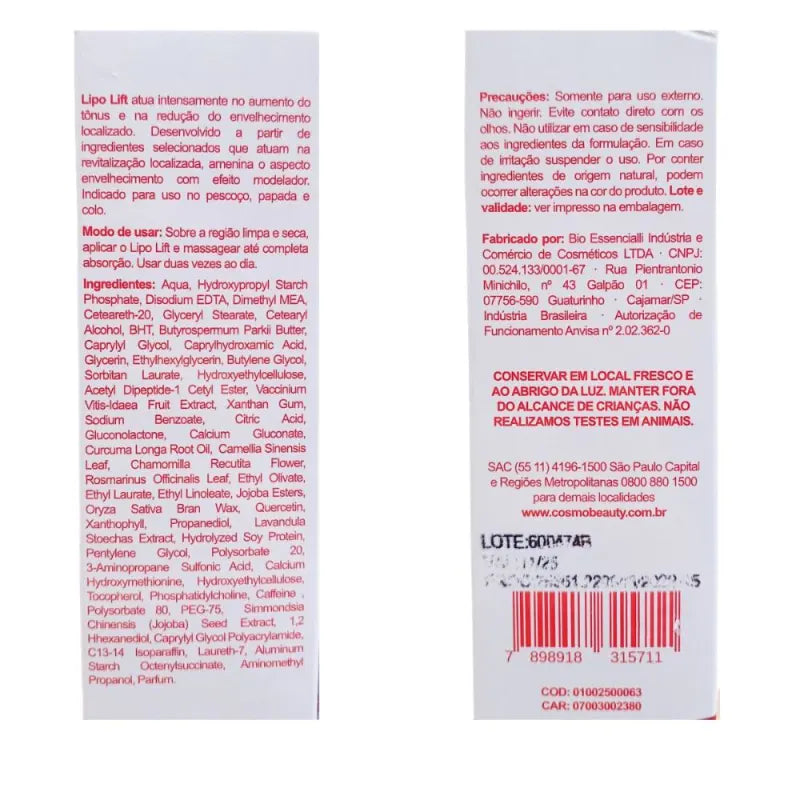Lipo Lift Concentrado Redutor Firmador de Papada CosmobeautyO Home Care Lipo Lift Redutor é um Booster antiage multifuncional para redução de papada e rejuvenescimento da área do pescoço e colo