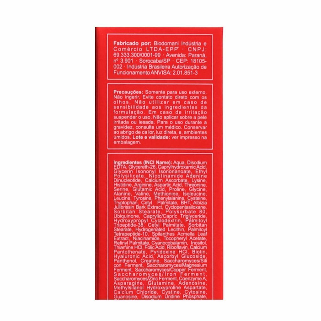 Ácido hialurônico não reticulado, nicotinamida adenina dinucleotídeo, vitamina C, E, A, B12, B5, B7, B8, B1, B6, B3, B9, B2, 26 aminoácidos, crystalide, prodizia pró melatonina, cobre, zinco, ferro , magnésio, silício quelado, coenzima Q10, matrixil, synth'6 , nopigmerin , +14.