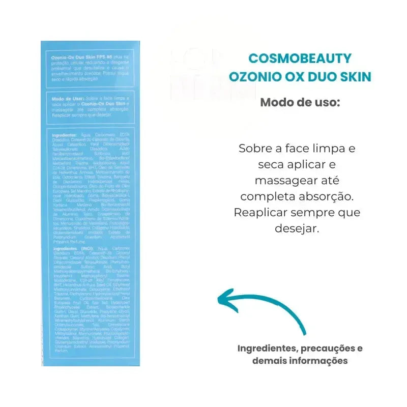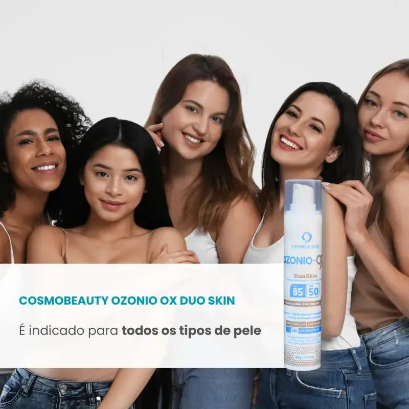 Protetor solar. Cosmobeauty Ozonio OX Duo Skin FPS 85 oferece proteção solar completa e de longa duração, ideal para todos os tipos de pele.
