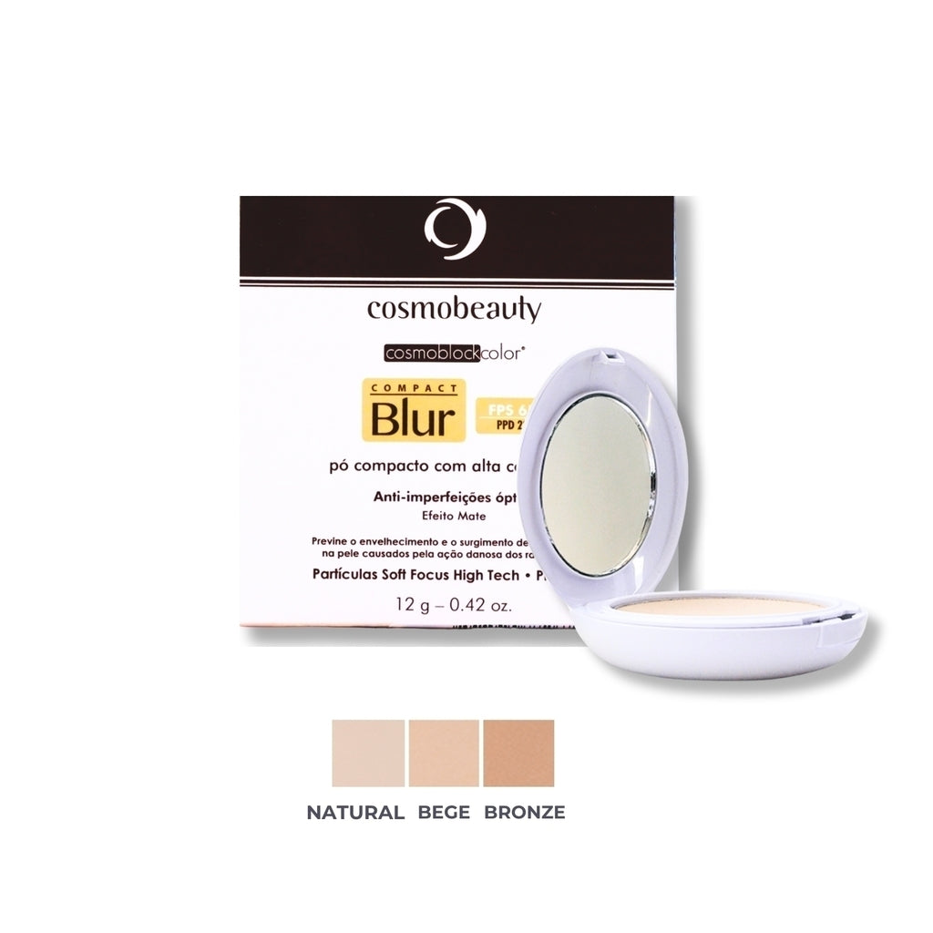 Pó compacto facial com filtro solar. Cosmobeauty Compact Blur FPS 65 PPD 21+ conta com textura leve e acetinada, que se difunde na pele, promovendo alta cobertura com ação anti-imperfeições e um efeito mate impecável.